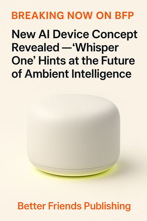 Better Friends Publishing is releasing an early glimpse at Whisper One, a design study representing the next wave of AI-native hardware — devices built not as screens or smart speakers, but as ambient intelligence tools meant to quietly assist in daily life.